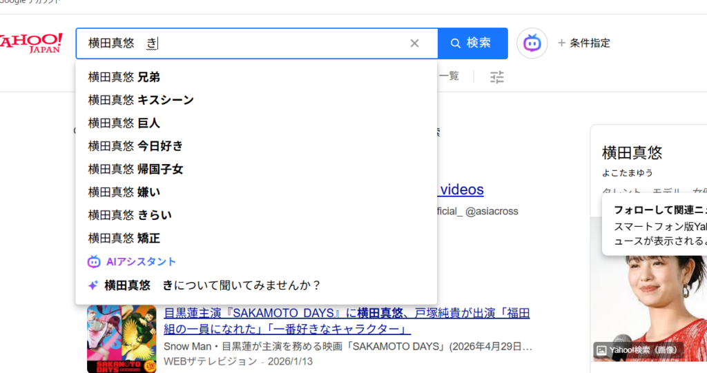 こちらの画面は、「横田真悠 帰国子女」と検索する人が多いということです。